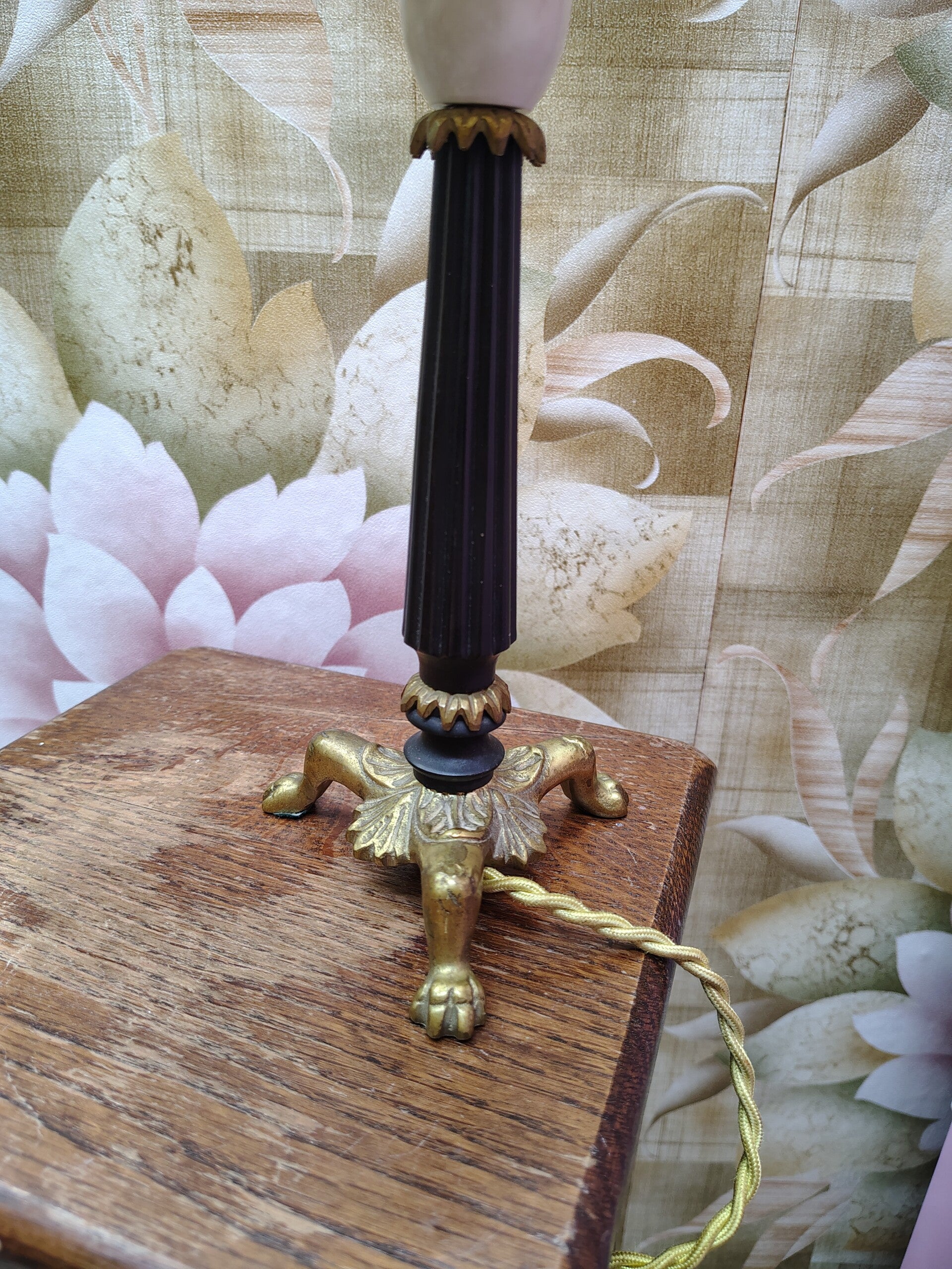 Deze tafellamp afkomt uit Denemarken heeft drie ijzeren pootjes en een kap. Circa 35 cm hoog