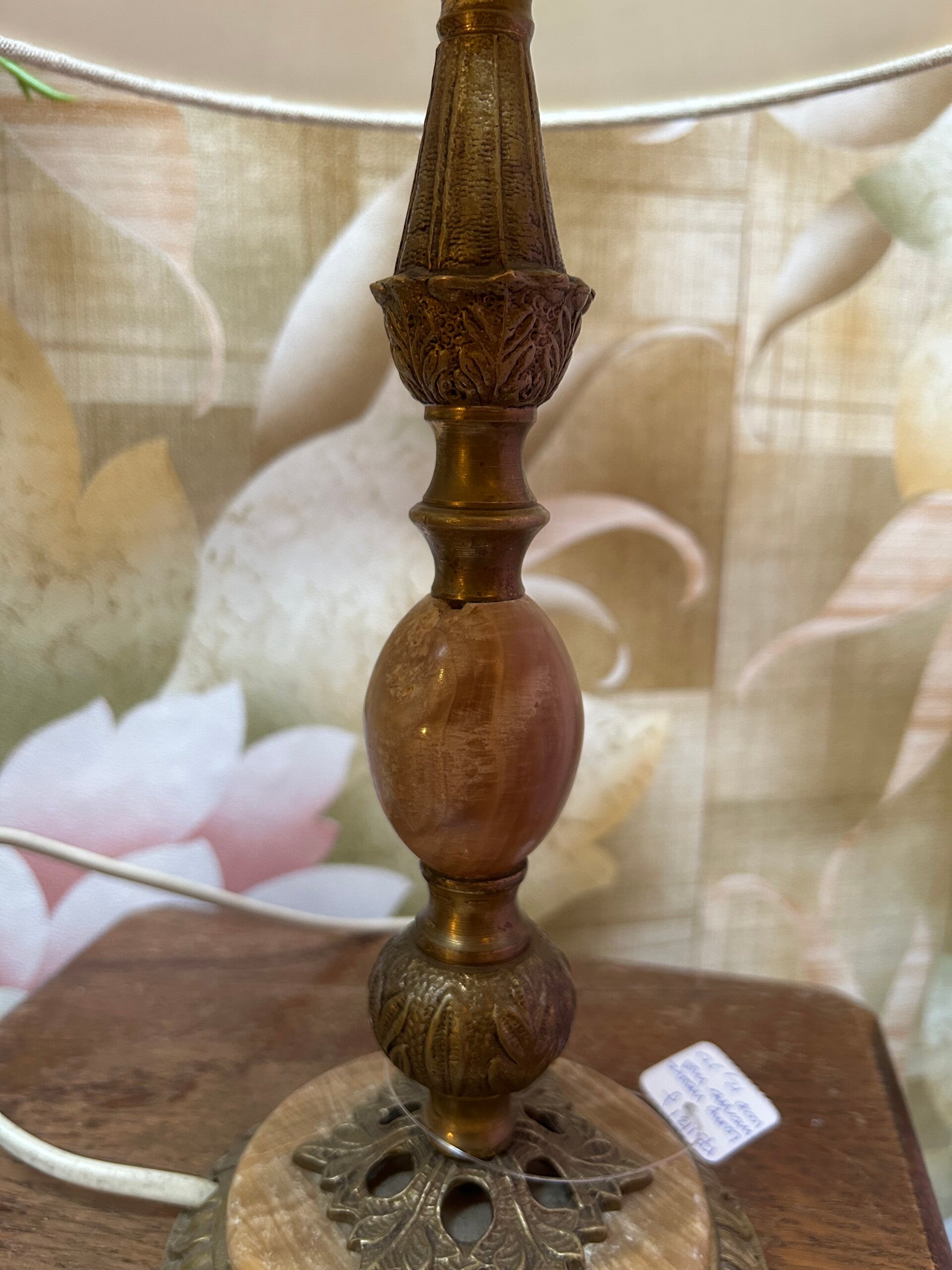 Materiaal; messing, marmer en stofKleur; goud, bruin en cremeBijzonderheden; marmer voet gebroken (zie foto) en chipje van marmer in midden stuk af.Hoogte; 38cm