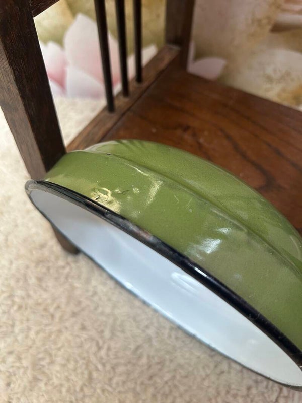 Conditie; redelijk, plekjes op de rand en beschadigingen onderop/binnen in.